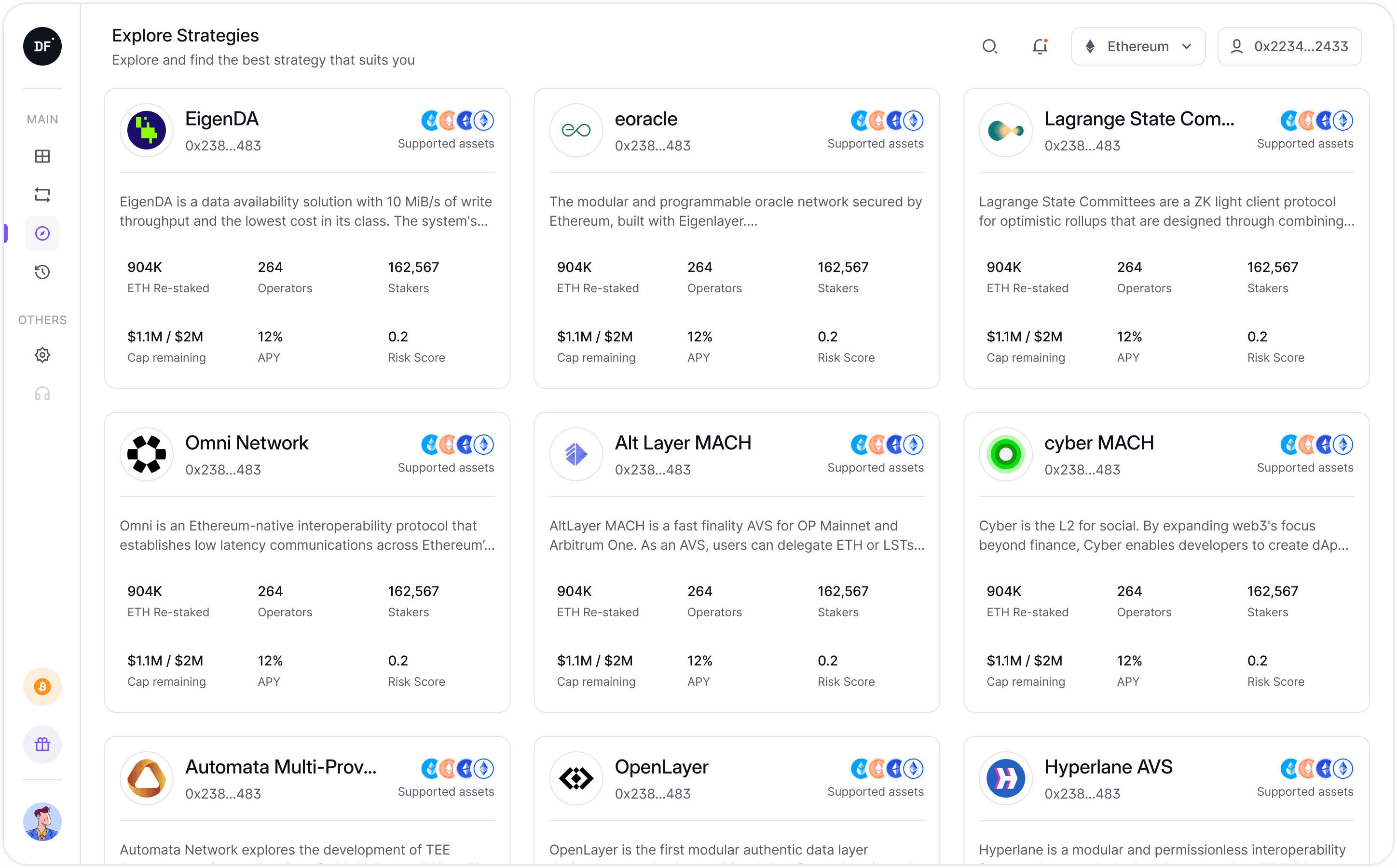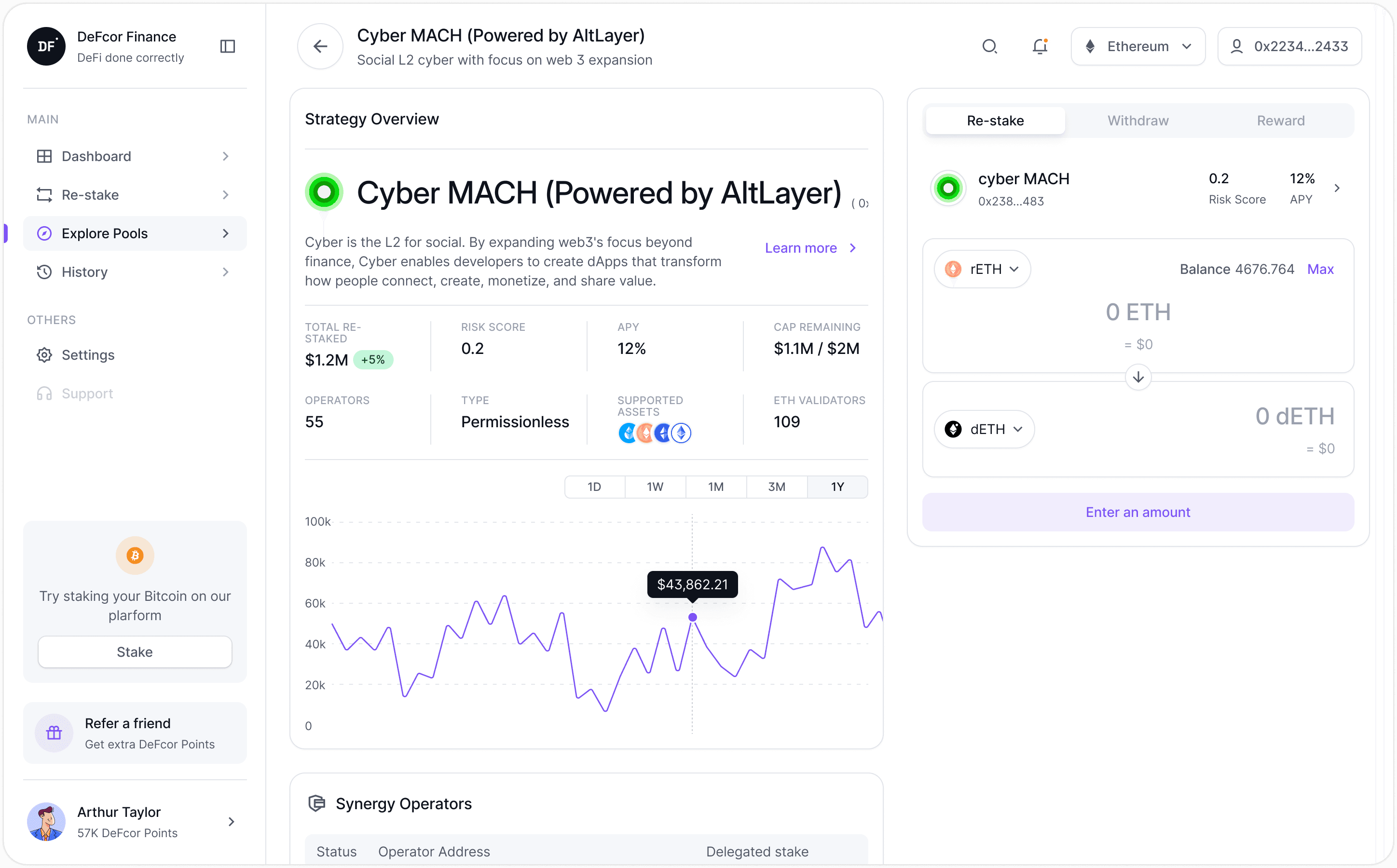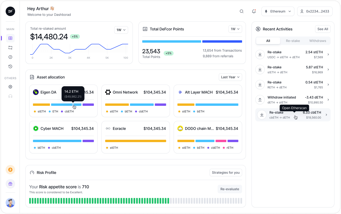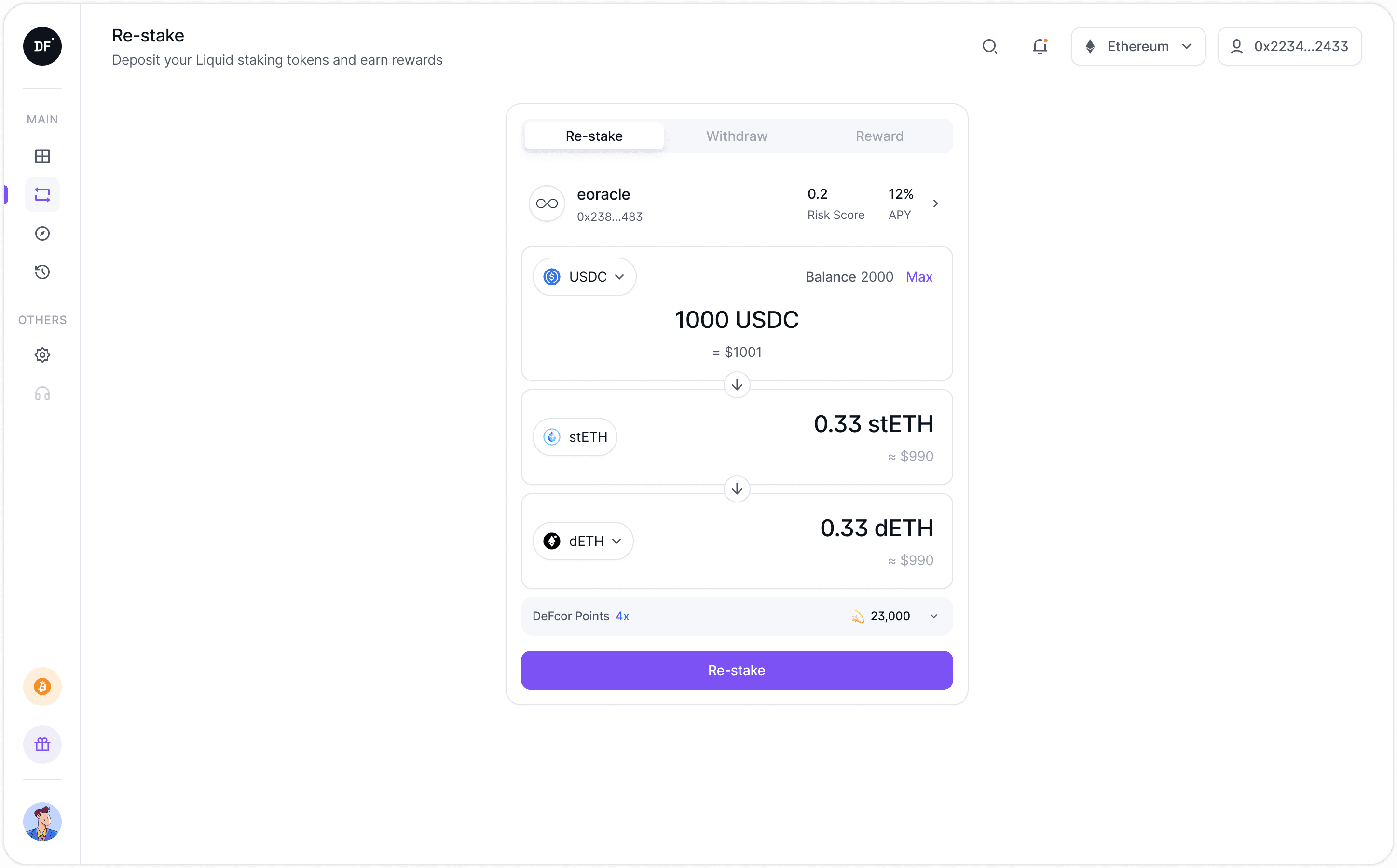 DeFcor Finance is a innovative platform in the decentralized finance (DeFi) space, offering advanced solutions for cryptocurrency holders. As a Product Designer with 4 years of experience in fintech and B2B data, I led the design of DeFcor's latest product: a Re-staking feature for Liquid Staking Token (LST) holders. This project aimed to provide users with a way to maximize their yields while maintaining the benefits of liquidity.